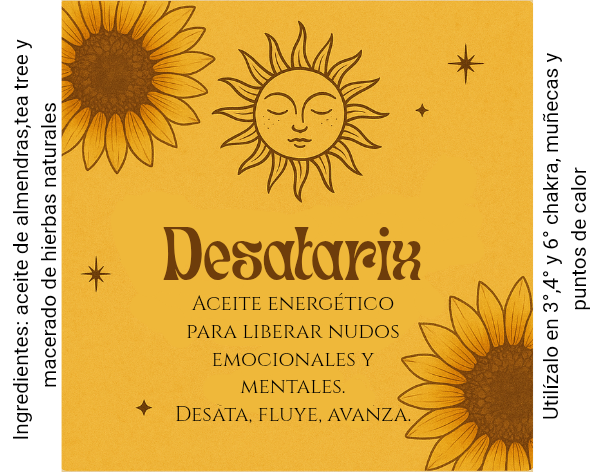 Desatarix es un rolón canalizado para momentos de estancamiento, indecisión o sensación de bloqueo. Esta mezcla abre caminos internos y externos, movilizando la energía estancada y favoreciendo la acción. Ideal para rituales de nuevos comienzos o antes de tomar decisiones importantes. Favorece el corte de lazos energético o físico, ayuda a sanar un duelo debido a su fórmula devolviendo un estado de neutralidad y sosiego al espíritu.