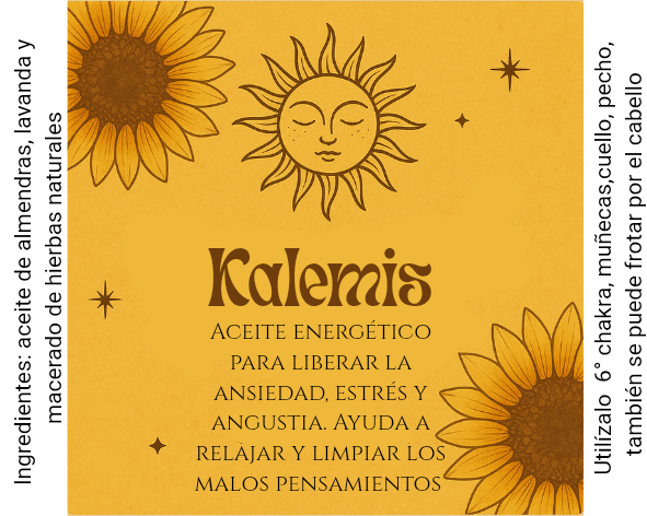 Kalemis es un rolón diseñado para invitar al cuerpo al descanso y al alma a la tranquilidad. Es ideal para momentos de ansiedad, estrés mental o dificultad para conciliar el sueño. Su mezcla de hierbas relajantes trabaja sobre el sistema nervioso y el campo emocional, devolviendo serenidad y dulzura.